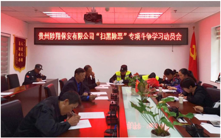 2019 年 4 月 8 日,貴州陟翔保安有限公司召集各區(qū)域經(jīng)理、項(xiàng)目經(jīng)理、項(xiàng)目隊(duì)長在公司會議室召開了“掃黑除惡” 專項(xiàng)斗爭學(xué)習(xí)動員大會。會議由公司總經(jīng)理陳春生主持,會上傳達(dá)學(xué)習(xí)了貴陽市公安局治安支隊(duì)保安服務(wù)管理大隊(duì)下發(fā)的《關(guān)于保安服務(wù)行業(yè)積極協(xié)助公安機(jī)關(guān)開展掃黑除惡專項(xiàng)斗爭和加強(qiáng)隊(duì)伍建設(shè)工作的通知》及《掃黑除惡應(yīng)知應(yīng)會》 知識,并就貫徹落實(shí)《通知》精神作周密的部署:一是要確實(shí)學(xué)懂弄通掃黑除惡專項(xiàng)斗爭的重大意義,從思想上高度重視;二是熟悉《掃黑除惡應(yīng)知應(yīng)會》知識,從行動上積極主動配合公安機(jī)關(guān)行動;三是認(rèn)真仔細(xì)開展排查清理保安員隊(duì)伍,對不適宜從事保安工作的人員迅速作清退處理,保持隊(duì)伍的純潔性;四是要將《通知》精神傳達(dá)到每個(gè)隊(duì)員,密切關(guān)注在職隊(duì)員的現(xiàn)實(shí)表現(xiàn),進(jìn)行動態(tài)管理,加強(qiáng)思想教育,及時(shí)制止不良苗頭;五是要規(guī)范隊(duì)員入職政審工作,嚴(yán)格按《保安服務(wù)管理?xiàng)l例》規(guī)定辦理入職手續(xù)。