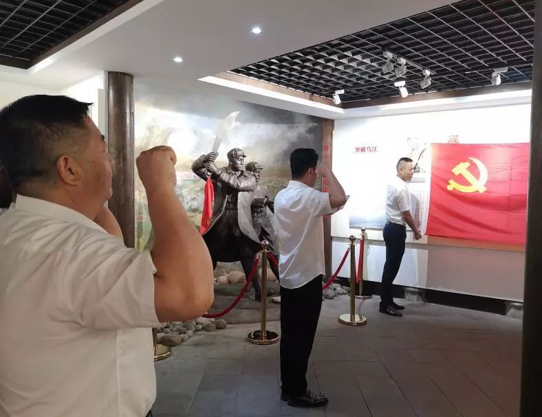 在陳列館內(nèi),陳春生書記帶領(lǐng)全體黨員、入黨積極分子面對(duì)黨旗重溫了入黨誓詞,鏗鏘的誓言響徹在紀(jì)念館內(nèi),使每位黨員再一次接受了心靈的洗禮,堅(jiān)定了初心,牢記了使命。
