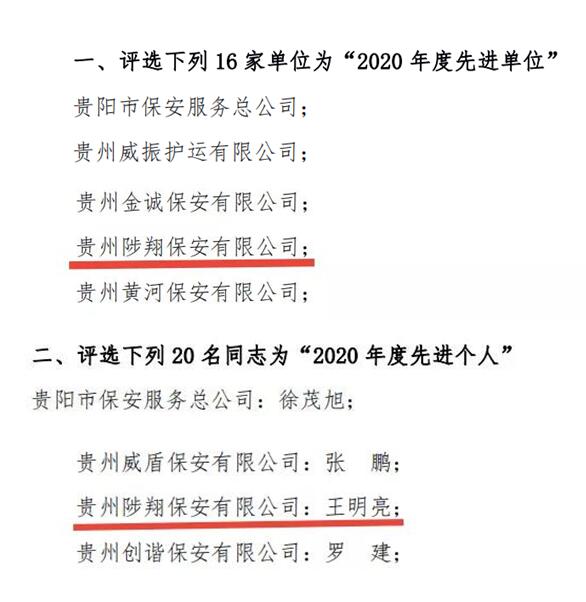 2021年的開年之際,貴州陟翔保安有限公司迎來了一個喜訊,公司被貴陽市保安協(xié)會授予2020年度“先進單位”的榮譽稱號。同時,公司員工王明亮被授予2020年度“先進個人”榮譽稱號。