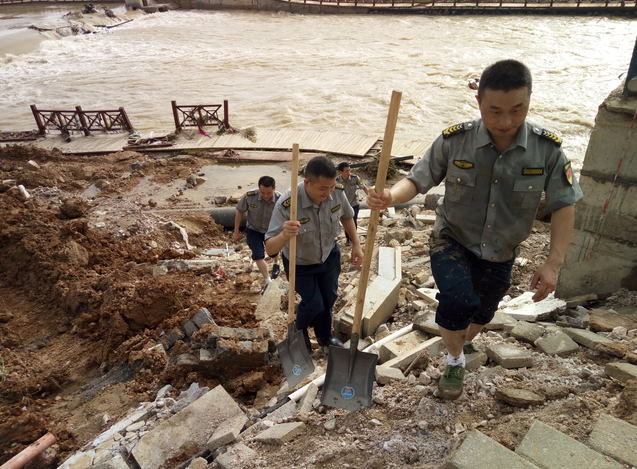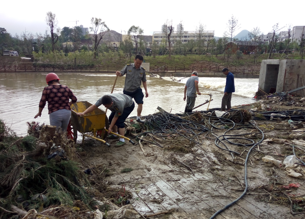 同時,洪水還導(dǎo)致了沿河兩岸絕大部分的沿江步道被淹,綠化、亮化、沿線亭閣、景觀、護(hù)欄均被嚴(yán)重沖毀,河岸邊步道上留下了大量白色垃圾和淤泥。為了使災(zāi)后堆積的垃圾能夠盡快得到清理,小分隊與環(huán)衛(wèi)工人一起出動清淤的同時還將被洪水沖毀的護(hù)欄邊的垃圾也一同清理干凈。