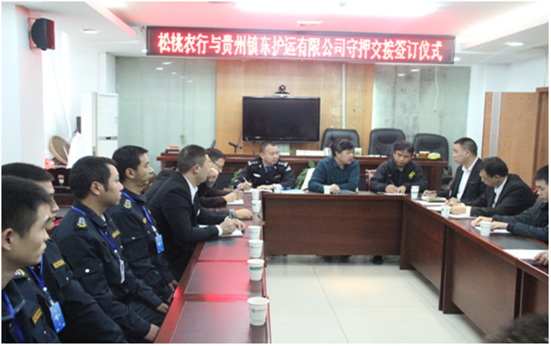 經過半年的業(yè)務對接和洽談,銅仁本部于11月16日至20日正式接手德江、石阡、印江、江口、松桃五縣農業(yè)銀行守押業(yè)務。銅仁市公安局保安大隊大隊長王世軍、銅仁市農行副行長任達輝、銅仁市農行保衛(wèi)部經理楊猛、銅仁本部總經理陳葉、副總經理劉興華、劉樹等出席了五縣守押業(yè)務交接儀式。