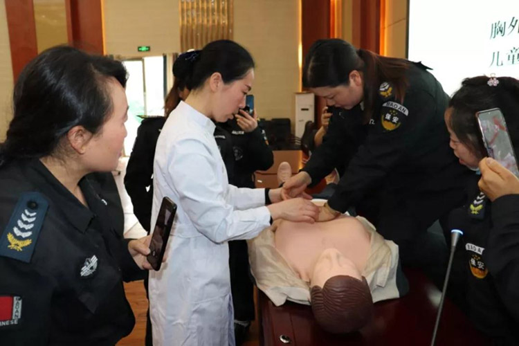 首先由新舟鎮(zhèn)衛(wèi)生院護(hù)士長一行人員為參訓(xùn)保安員講解急救要領(lǐng),現(xiàn)場演示徒手心肺復(fù)蘇操作技巧,并要求每位保安員實(shí)操練習(xí)。