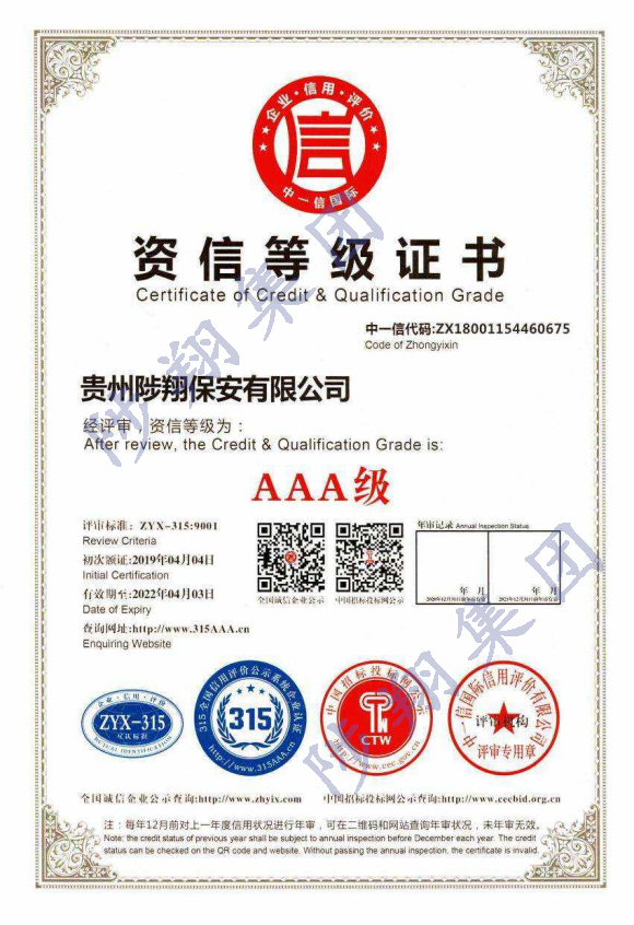 資信等級證書AAA級